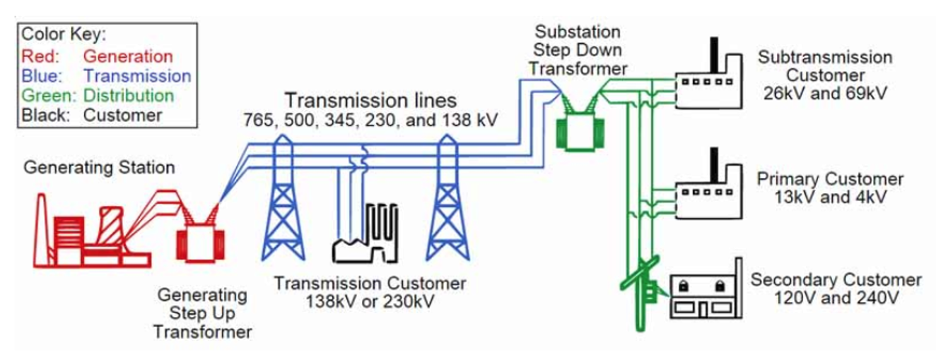 To discuss in a bit more detail how this can work first see this diagram of the basic layout of a grid. Power infrastructure is distributed from generation stations through networks of transmission and transformation to the low voltage systems at the home. The grid infrastructure can become overloaded at any stage in the grid chain, resulting in a loss of power for all customers downstream.